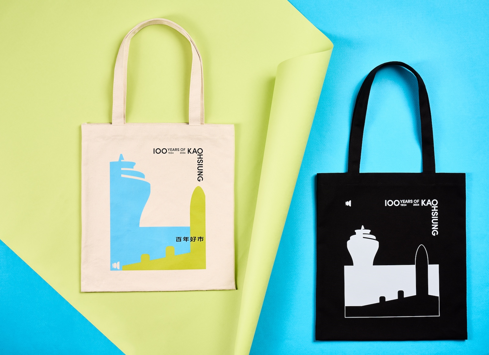 運用主視覺象徵高雄百年發展的「海空雙港」意象,推出雙色及黑白組合兩款帆布袋,簡潔俐落的造型設計,傳達海空聯運造就高雄城市發展的歷史底蘊,值得收藏。