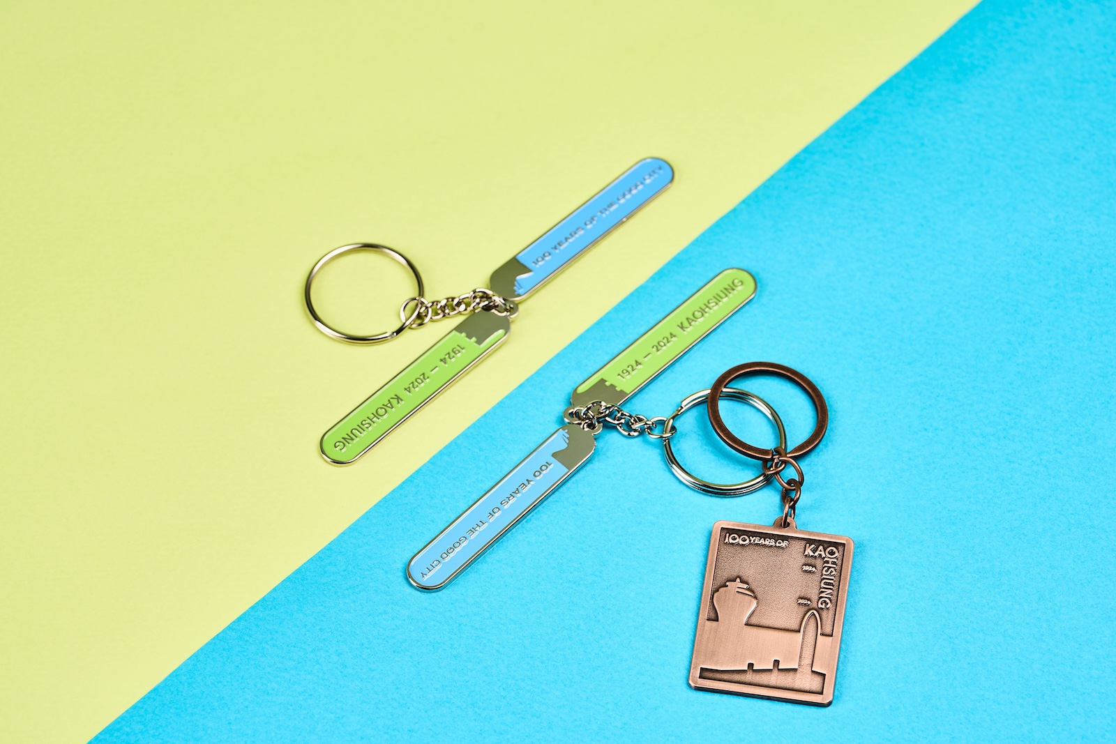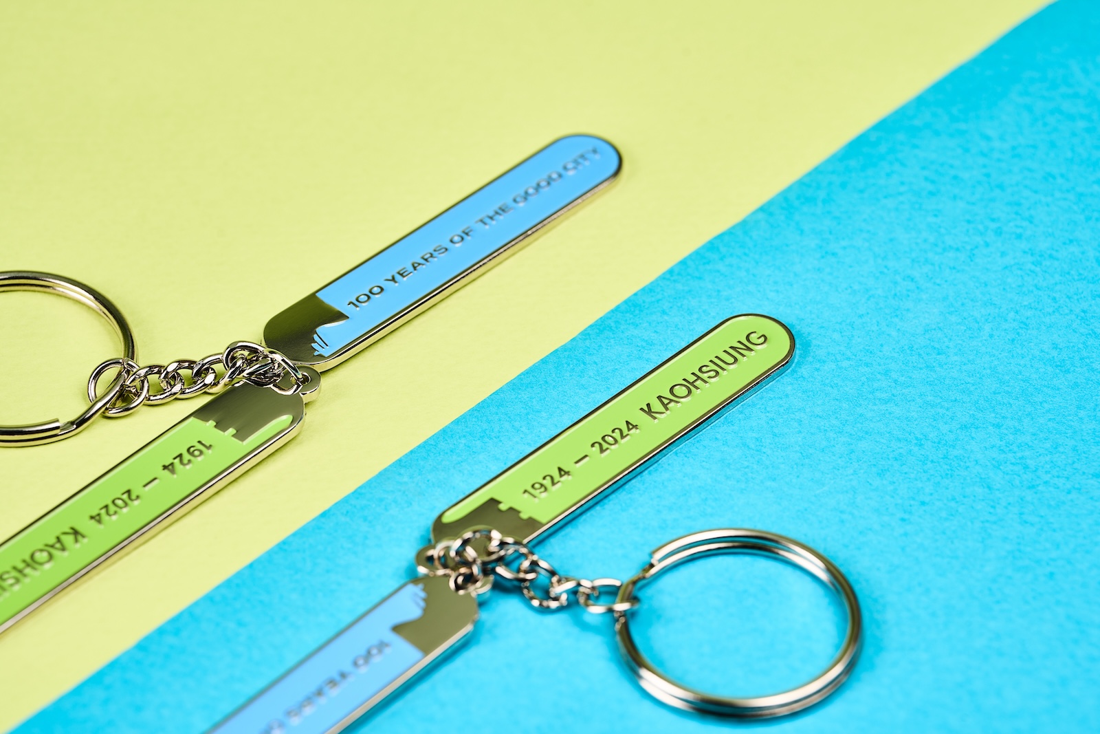 鑰匙圈使用金屬材質加以琺瑯填色製作,以雙片雙色凸顯百年好市「100 YEARS OF THE GOOD CITY」的設計,輕鬆自在將百年高雄隨身帶著走。